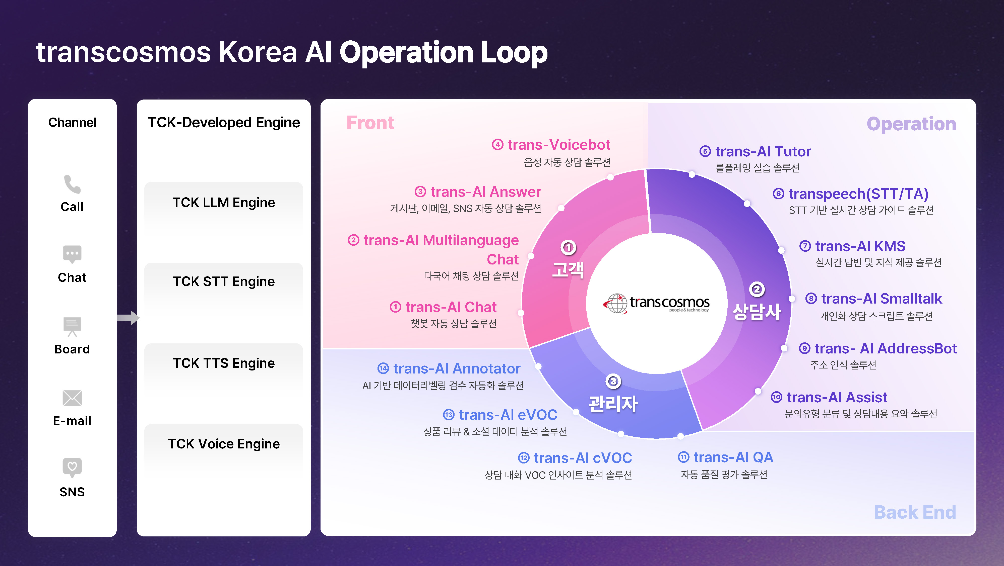 이 밖에도 트랜스코스모스코리아는 실시간 지식 제공 솔루션 ‘t-AI KMS’, 게시판∙이메일∙SNS 자동 상담 솔루션 ‘t-AI Answer’, 데이터라벨링 검수 자동화 솔루션 ‘t-AI Annotator’ 등 다양한 AICC 솔루션을 80여 개 현장에서 서비스 중이다.